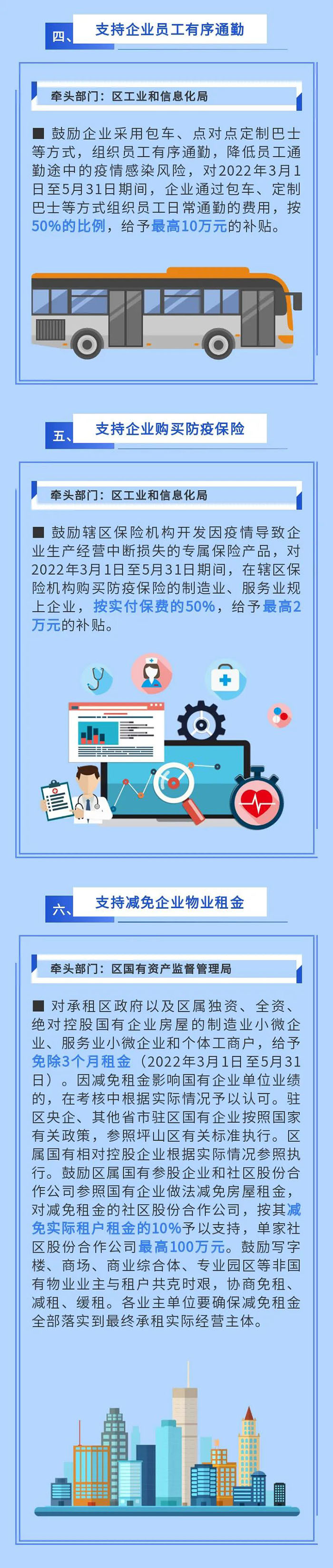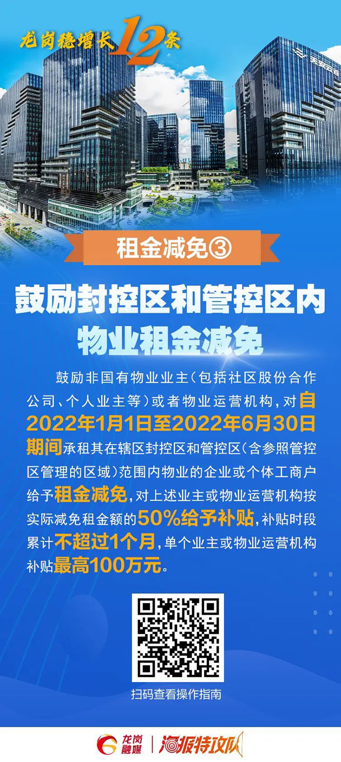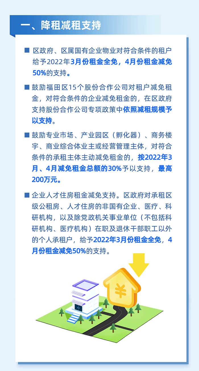 鼓勵倡導(dǎo)其他市場主體參照減免物業(yè)租金。對2022年3月1日至5月31日期間實際減免租金60萬元以上的社區(qū)股份合作公司(按歸屬社區(qū)股份合作公司的租金計算),及經(jīng)營管理工業(yè)園區(qū)、寫字樓、商場等物業(yè)的企業(yè),按其減免實際租戶租金的20%予以支持,單家企業(yè)最高200萬元。(牽頭單位:區(qū)投資推廣和企業(yè)服務(wù)中心)