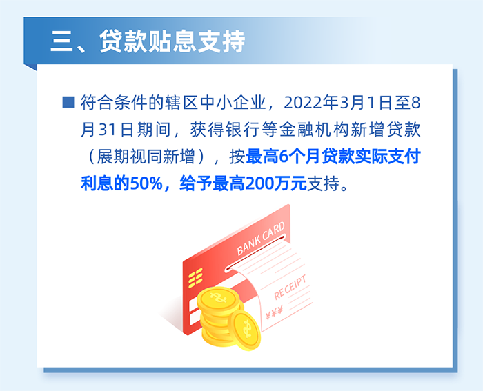 8.金融助力中小微企業(yè)發(fā)展,降低企業(yè)融資成本,對南山區(qū)中小微企業(yè)在2022年2月16日至4月30日期間(以發(fā)放貸款時間為準(zhǔn)),獲得銀行等金融機(jī)構(gòu)貸款(含展期)的,按實際支付利息最高50%給予貼息支持,貼息期限不超過3個月,每家企業(yè)不超過50萬元。(責(zé)任單位:區(qū)金融發(fā)展服務(wù)中心)