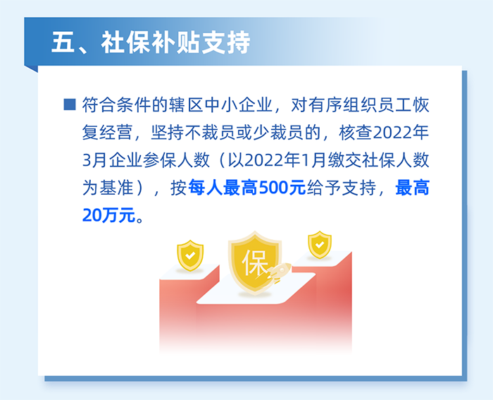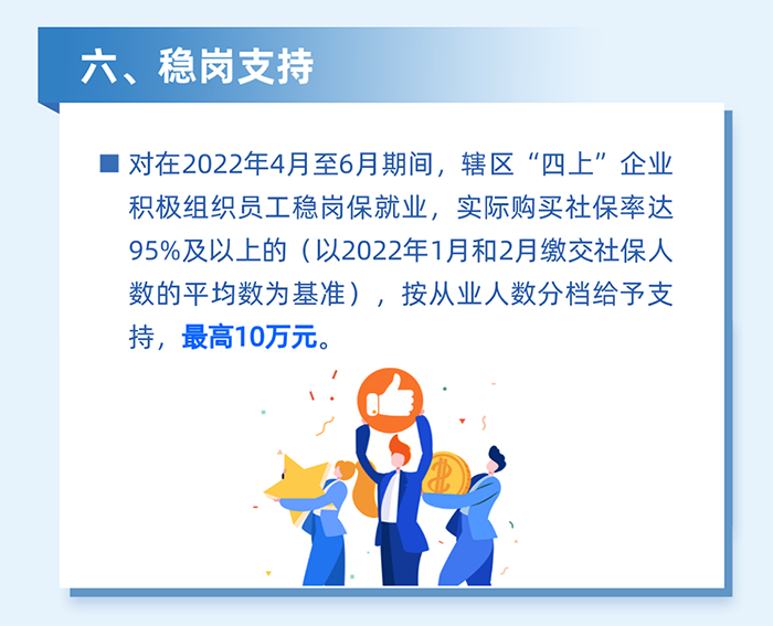 鼓勵企業(yè)穩(wěn)崗留工。對區(qū)四類百強(qiáng)企業(yè)堅持不裁員或少裁員的(2022年3-5月平均繳交失業(yè)保險人數(shù)不低于2022年1月的95%),按2022年3月實際繳納失業(yè)保險人數(shù)給予500元/人的補(bǔ)貼,單家企業(yè)最高20萬元。(牽頭單位:區(qū)人力資源局)