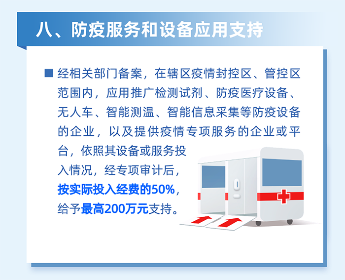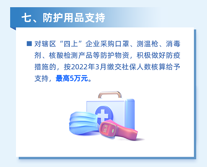減輕企業(yè)防疫負(fù)擔(dān)。對為員工采購口罩、測溫槍、消毒劑、核酸檢測產(chǎn)品等防疫用品,以及應(yīng)用檢測試劑、防疫醫(yī)療設(shè)備、智能測溫、數(shù)字化信息采集、無人車等數(shù)字防疫設(shè)備的區(qū)四類百強(qiáng)企業(yè),按2022年3月實際繳納失業(yè)保險人數(shù)給予100元/人的補(bǔ)貼,單家企業(yè)最高20萬元。(牽頭單位:區(qū)工業(yè)和信息化局、科技創(chuàng)新局)